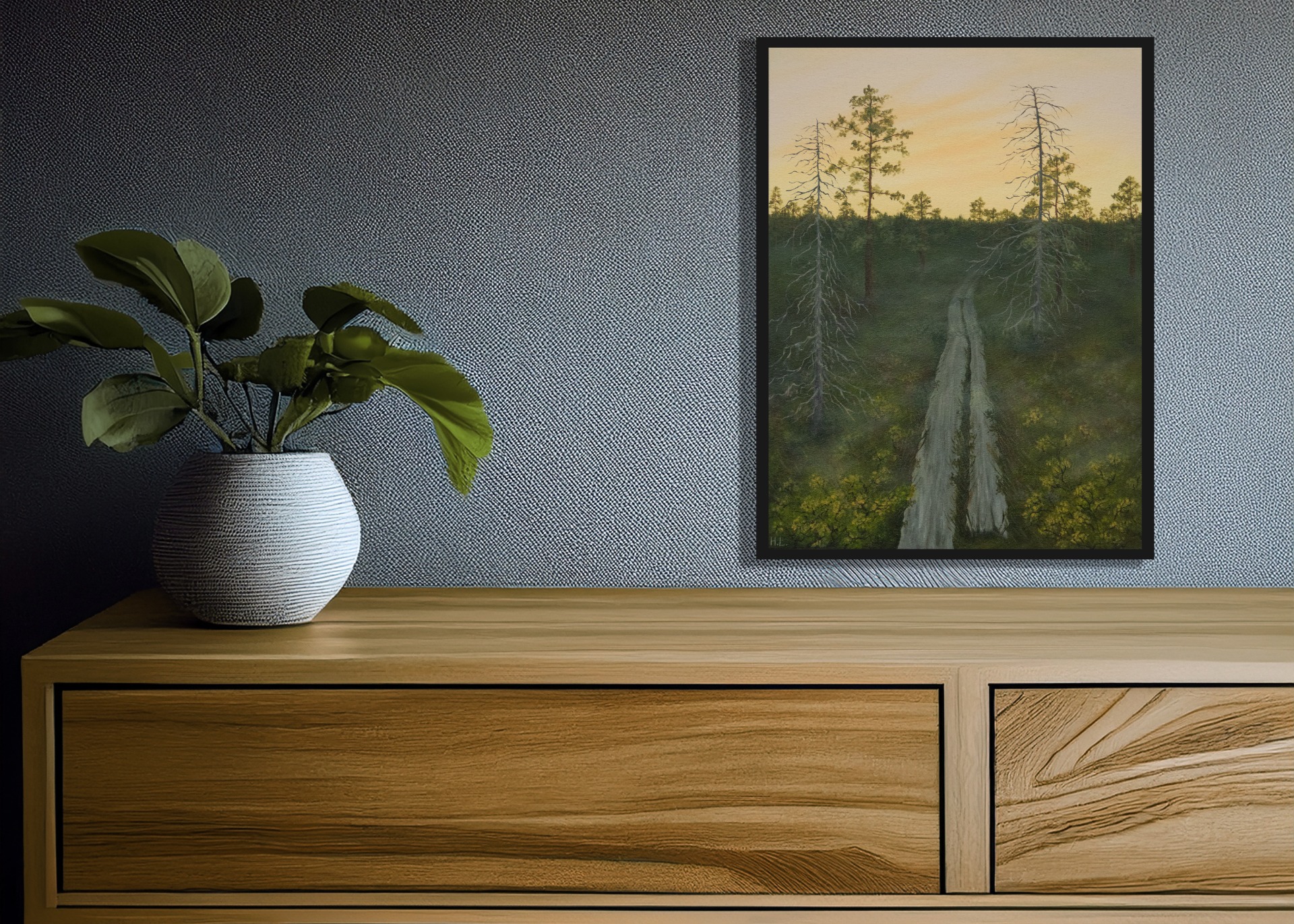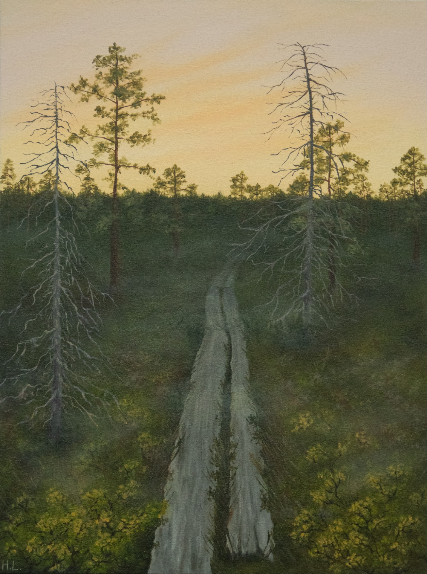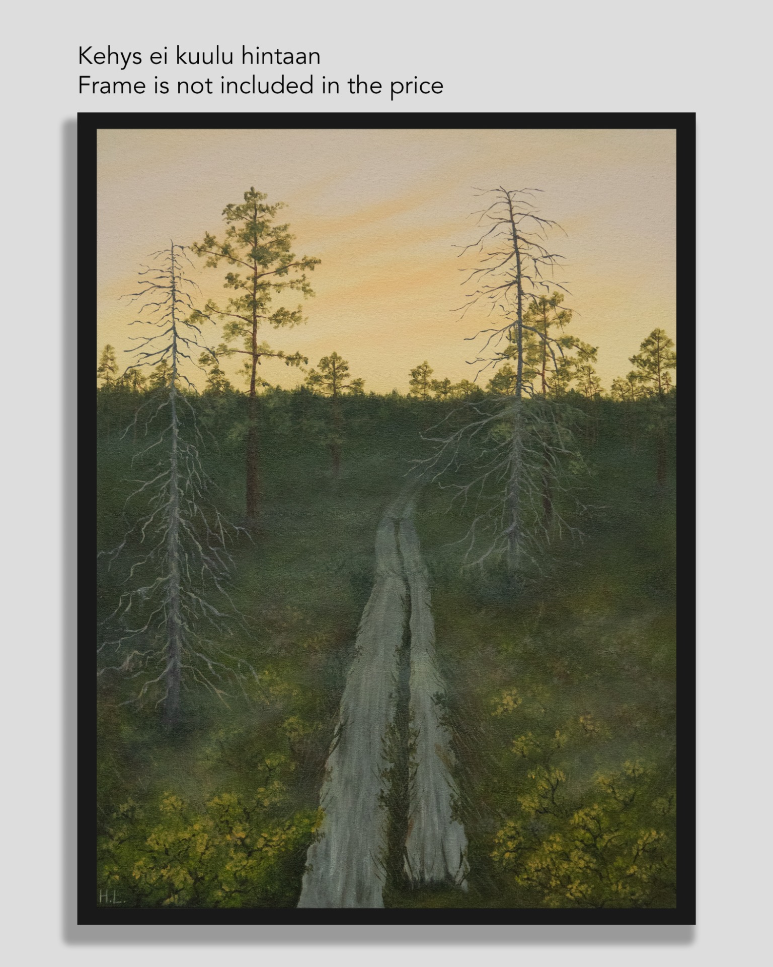 Tämä maalaus vie katsojan usvaisen suon pitkospuille aamuauringon värjätessä taivaan keltaiseksi. Akryylimaalaus kangaspahvipohjalle, koko 30x40x0,3 cm (L,K,S). Maalaus suositellaan kehystettäväksi, ja se sopii valokuvakehykseen, jos siinä on tarpeeksi tilaa 3 mm paksulle kuvalle. Kehys ei kuulu hintaan. Arvioitu toimitusaika noin kaksi viikkoa. Kuljetus Suomen sisällä kuuluu hintaan.