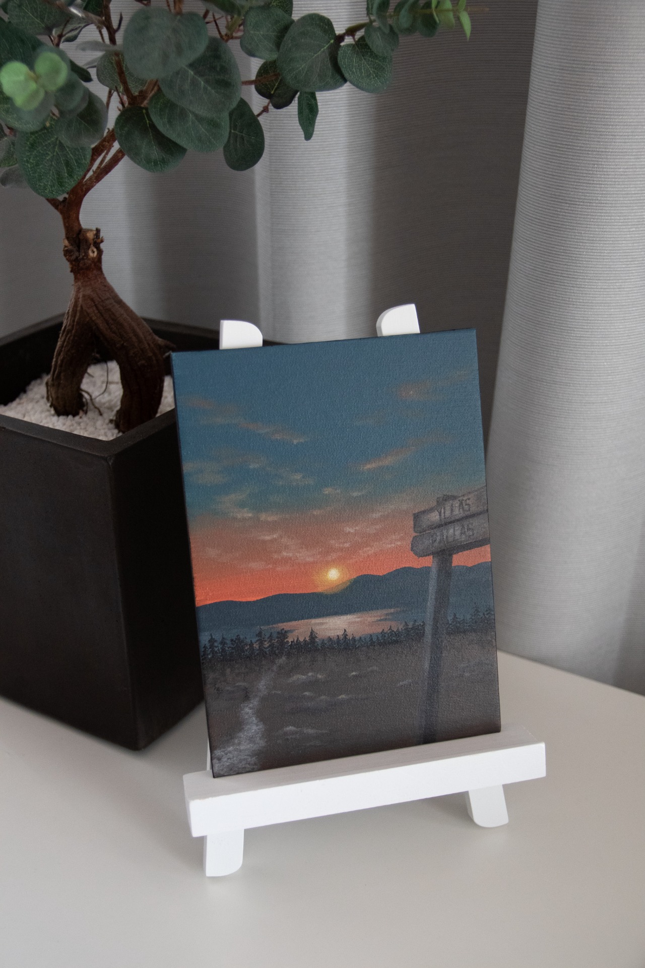Äkäskeron kuuluisa Ylläkselle ja Pallakselle tietä osoittava kyltti keskiyön auringossa. Akryylimaalaus kangaspahvipohjalle, koko 16x22 cm. Kortin paksuus noin 3 mm. Oranssi taustapahvi, maalauksen pinta viimeistelty vernissalla. Toimitusaika noin kaksi viikkoa. Toimitus Suomen sisällä kuuluu hintaan.