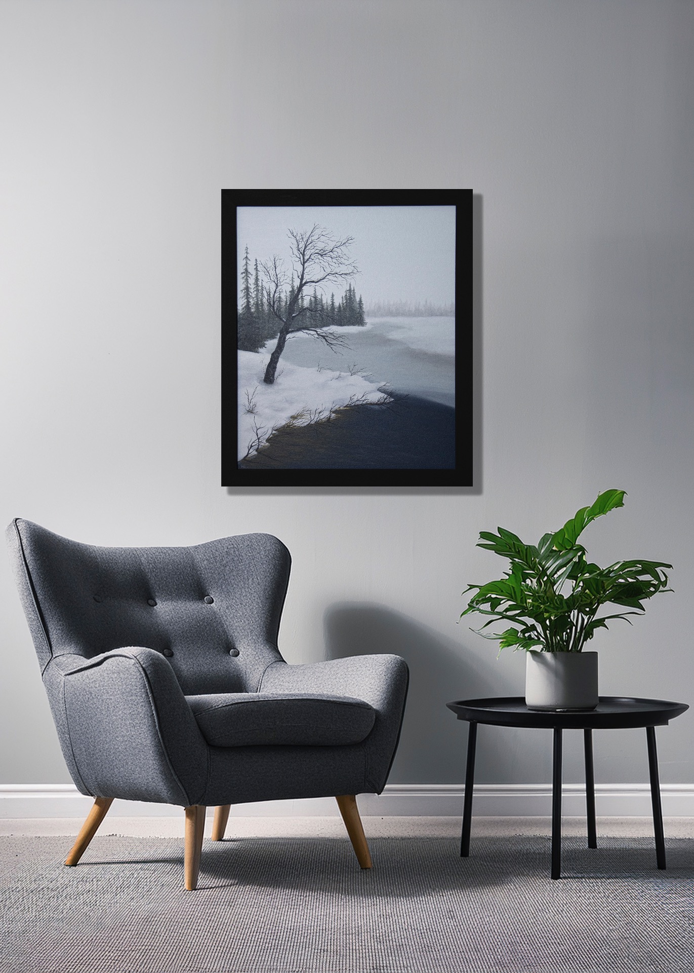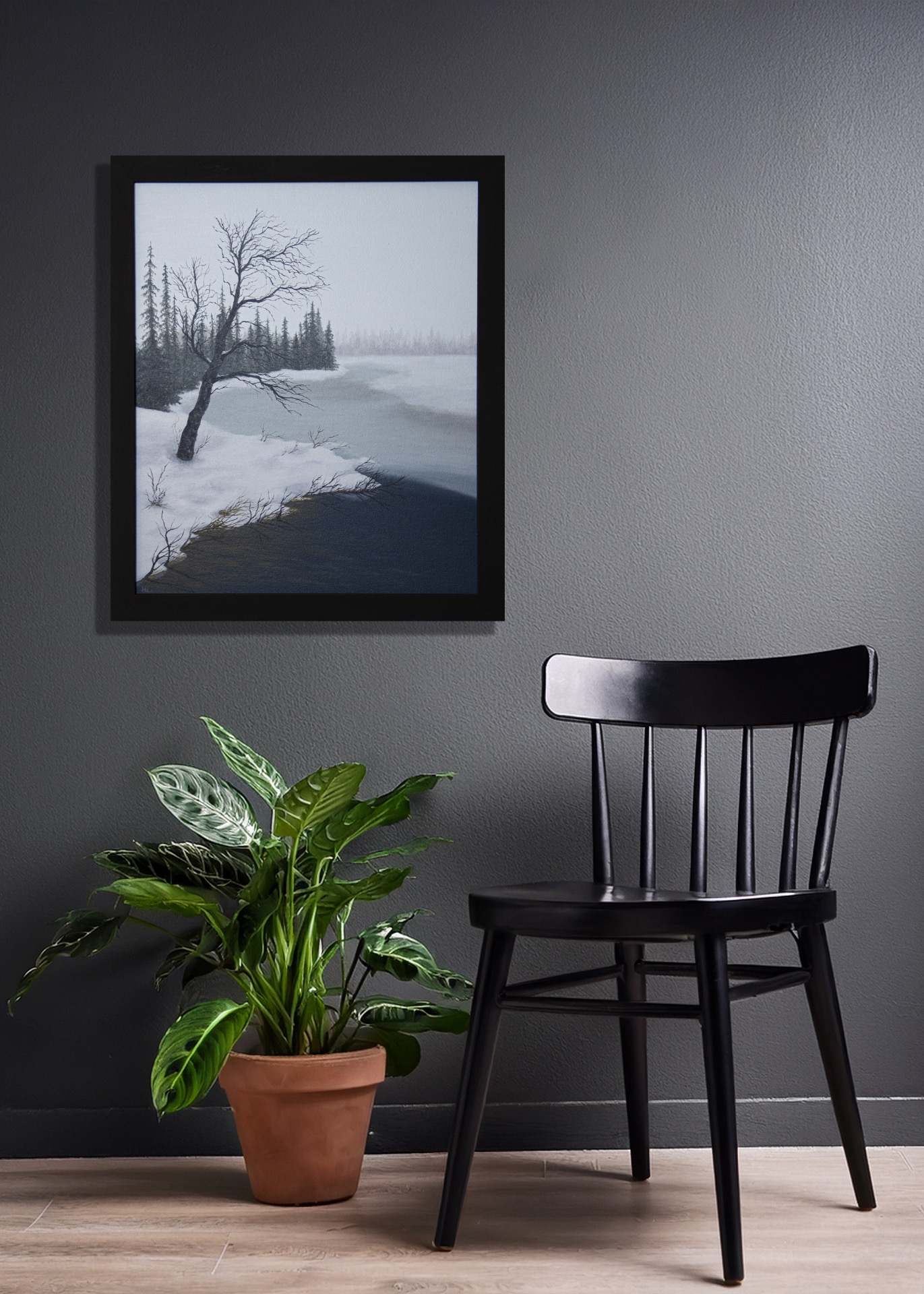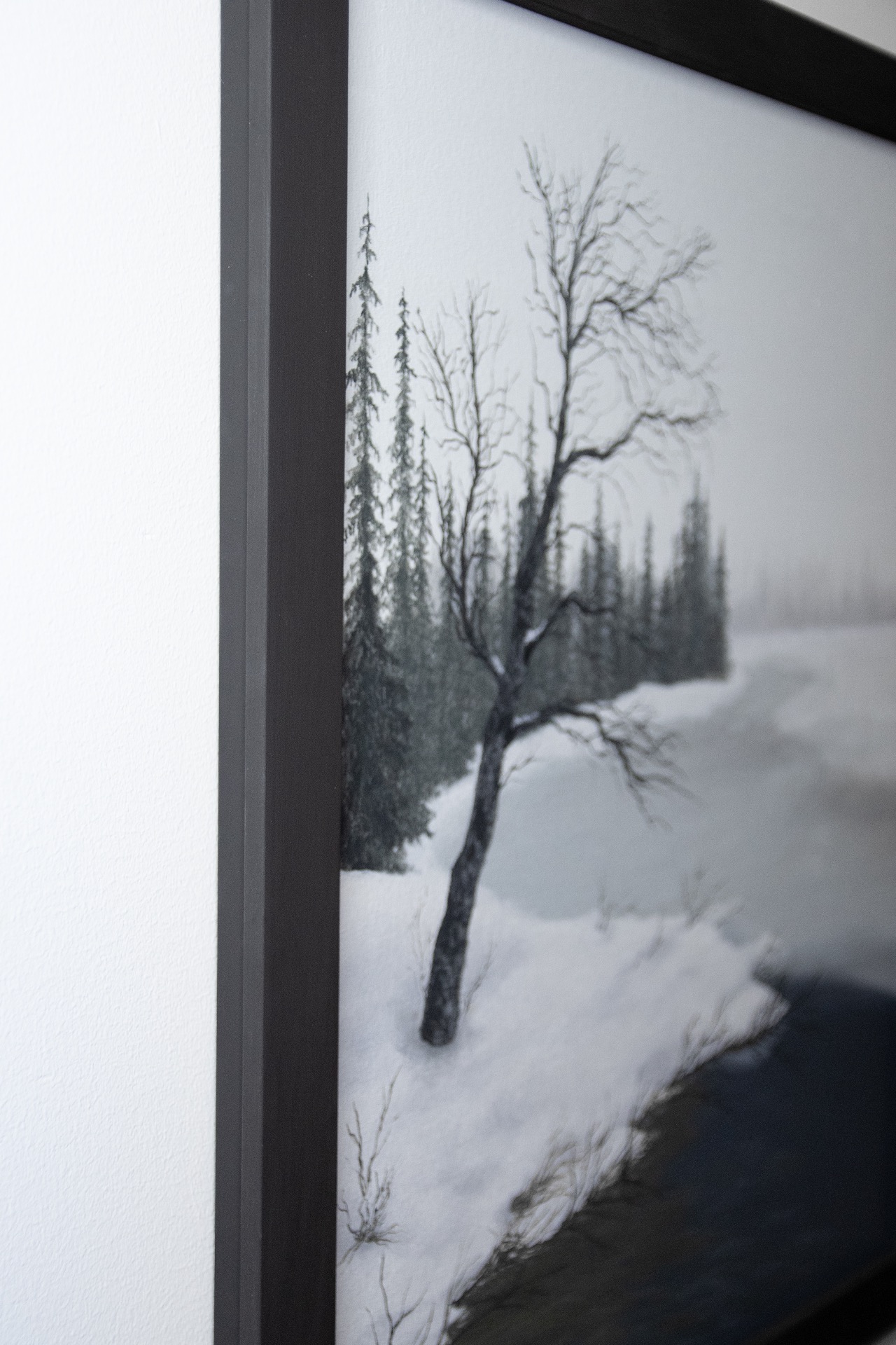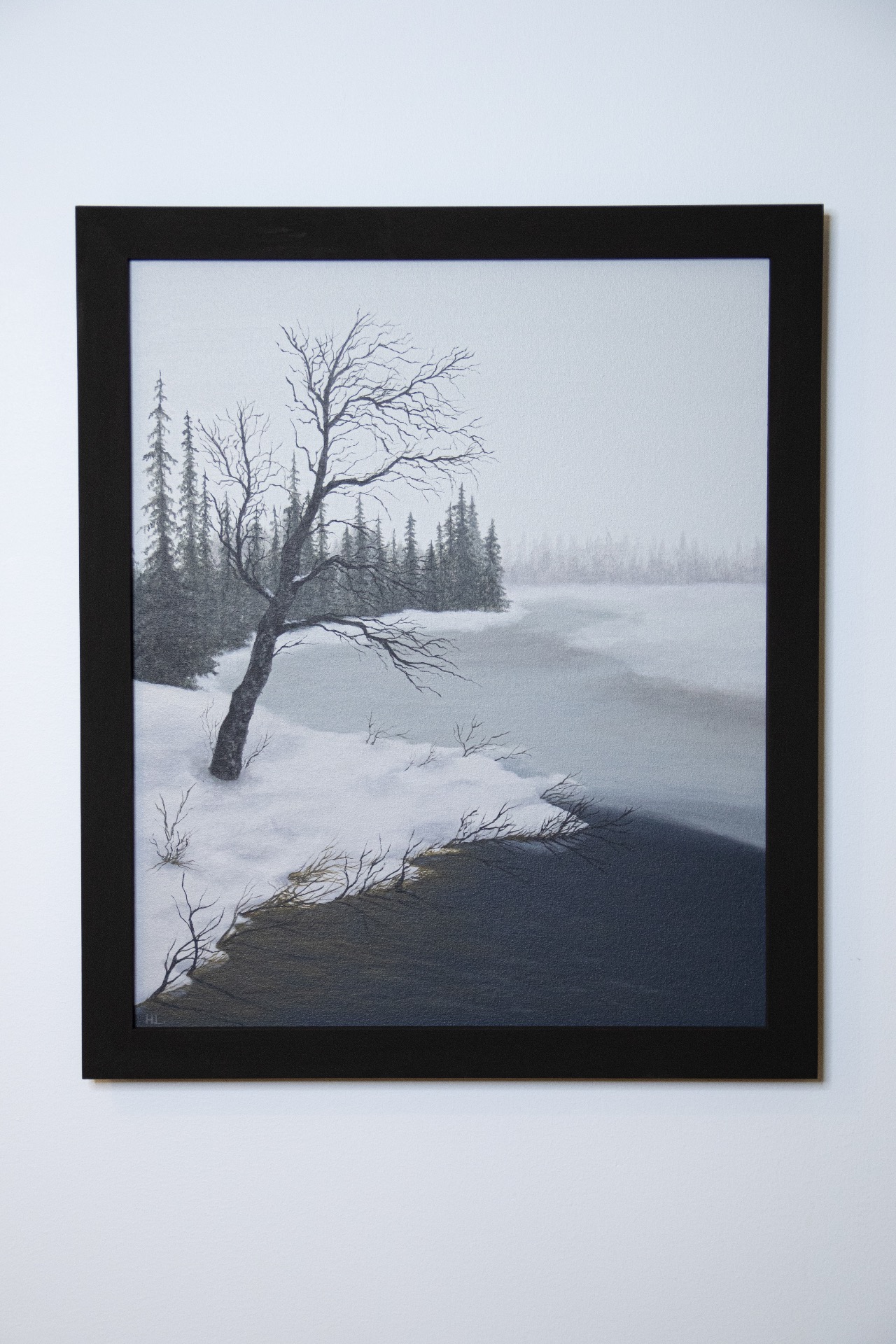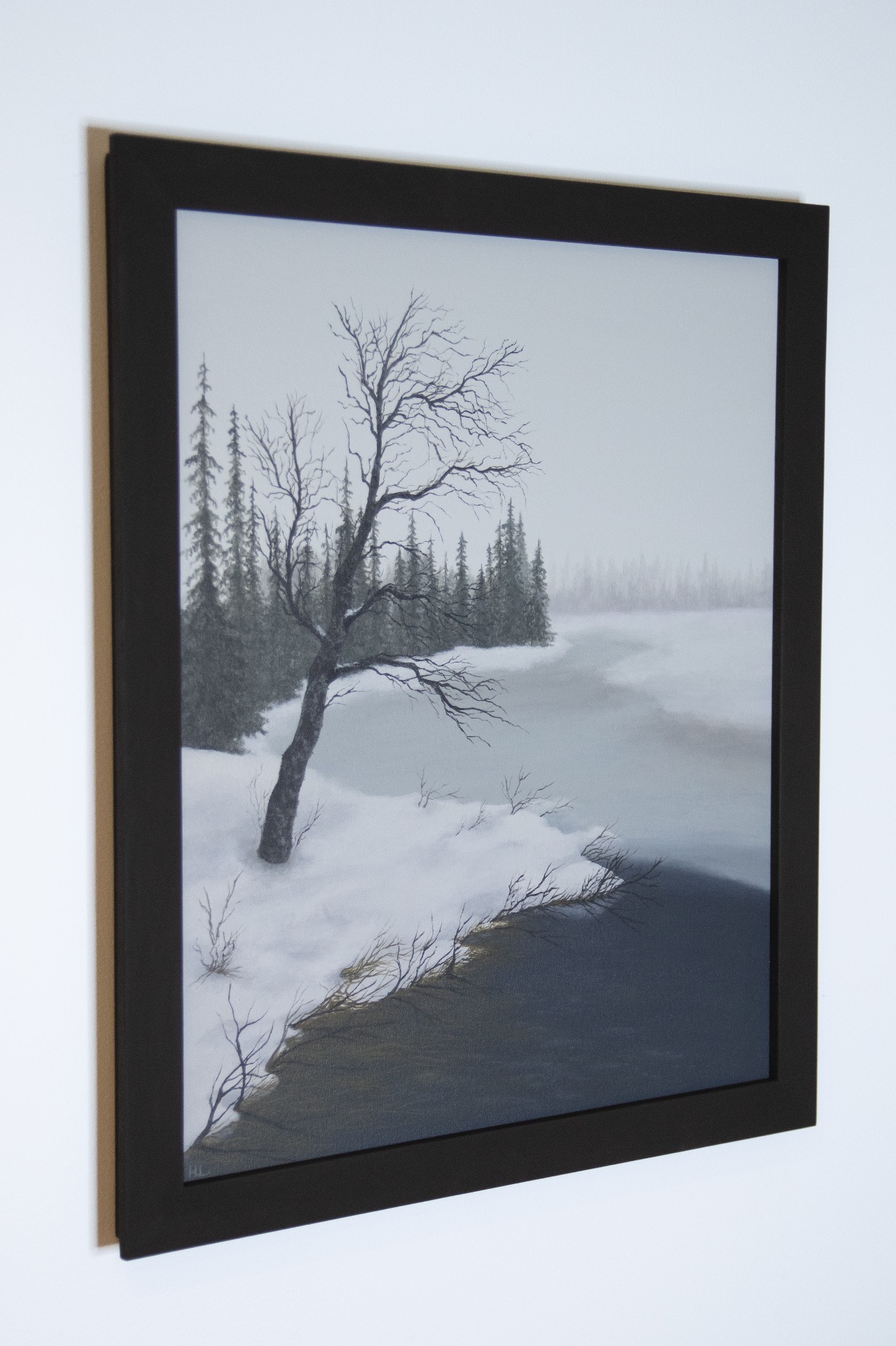 Maalaus ensilumen peittämästä järvenrantamaisemasta. Maalaus on saanut inspiraationsa Keimiöjärven rannasta. Akryylimaalaus kangaspahvipohjalle, jossa männystä valmistetut kehykset. Maalauksen koko noin 48x58 cm, ulkomitat kehysten kanssa noin 56x66x3,5 cm (L,K,S). Kehykset on maalattu mattamustalla. Ripustusvalmis. Arvioitu toimitusaika noin kaksi viikkoa. Kuljetus Suomen sisällä kuuluu hintaan.