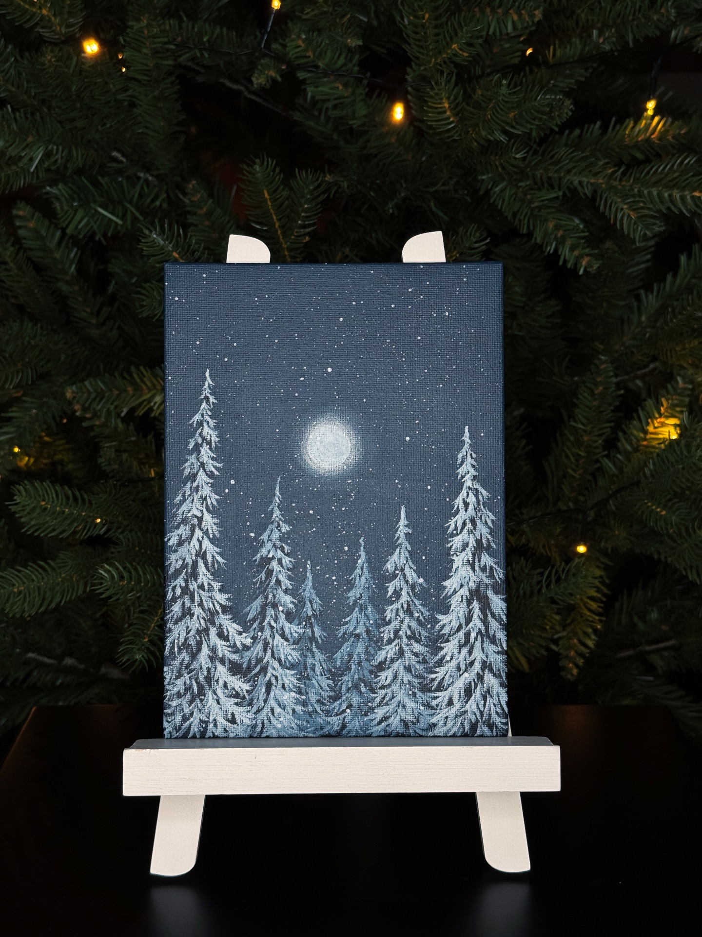 Lumiset kuuset kuutamon valossa. Akryylimaalaus kangaspahvipohjalle, koko 16x22 cm. Kortin paksuus noin 3 mm. Vaaleanharmaa/luonnonvalkoinen taustapahvi, maalauksen pinta viimeistelty vernissalla. Toimitusaika noin kaksi viikkoa. Toimitus Suomen sisällä kuuluu hintaan.