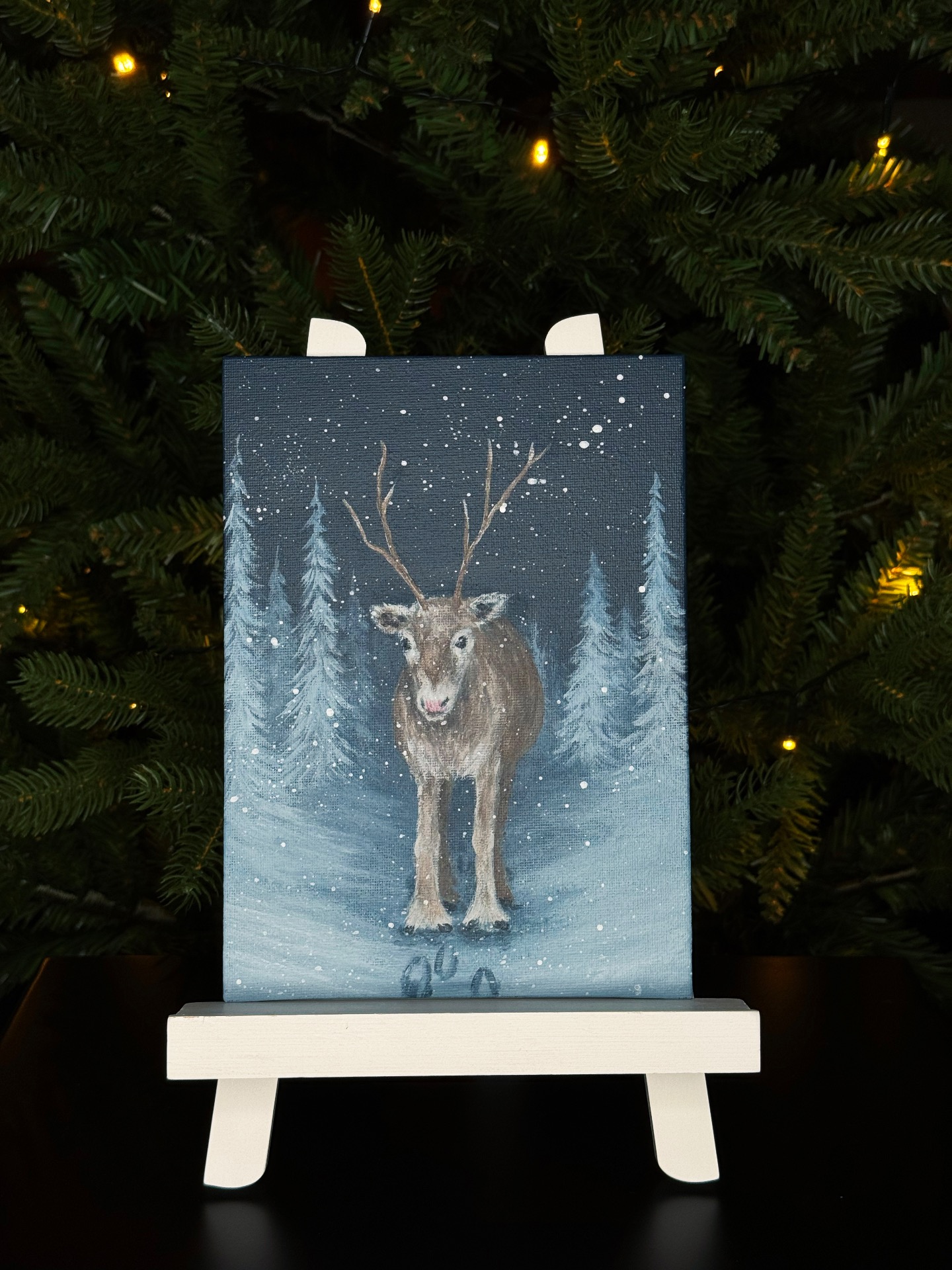 Pienen poron ensimmäinen talvi. Akryylimaalaus kangaspahvipohjalle, koko 16x22 cm. Kortin paksuus noin 3 mm. Vaaleanharmaa/luonnonvalkoinen taustapahvi, maalauksen pinta viimeistelty vernissalla. Toimitusaika noin kaksi viikkoa. Toimitus Suomen sisällä kuuluu hintaan.