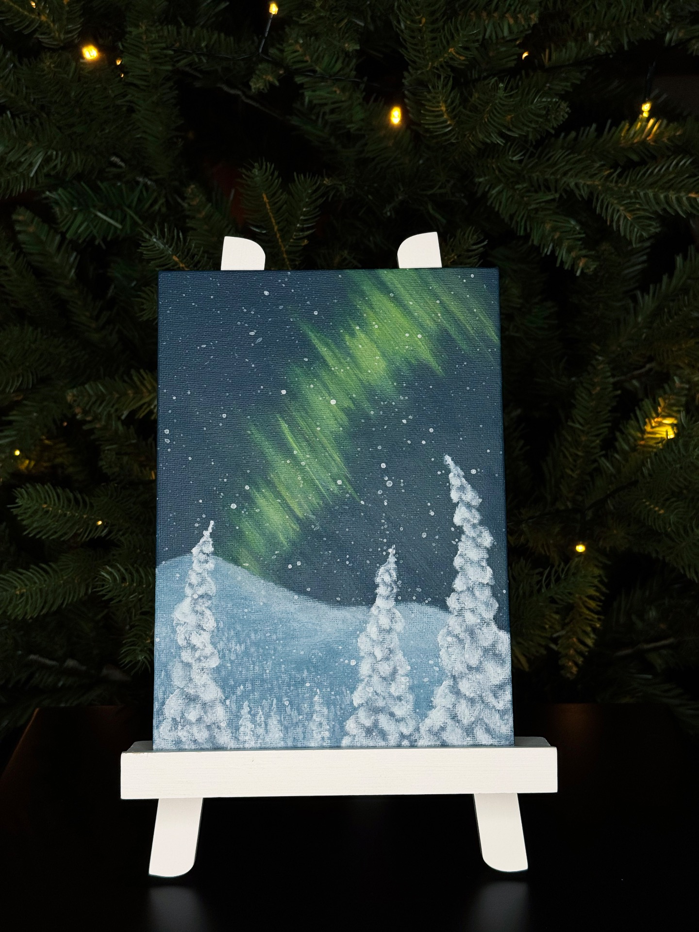 Tykkylumikuuset tunturissa revontulten loimutessa. Akryylimaalaus kangaspahvipohjalle, koko 16x22 cm. Kortin paksuus noin 3 mm. Vaaleanharmaa/luonnonvalkoinen taustapahvi, maalauksen pinta viimeistelty vernissalla. Toimitusaika noin kaksi viikkoa. Toimitus Suomen sisällä kuuluu hintaan.