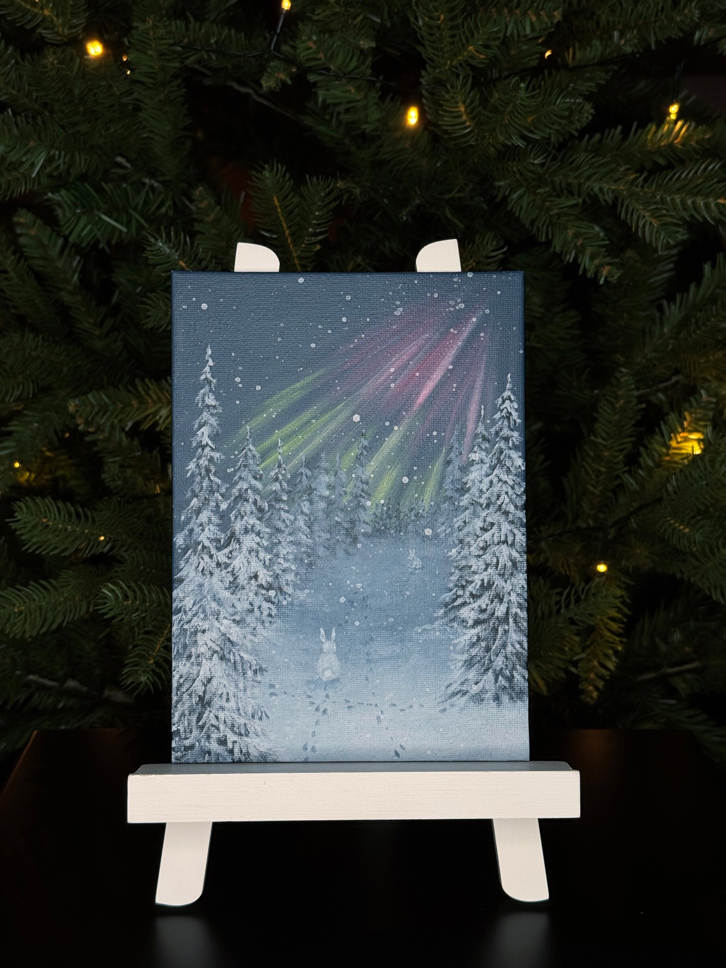 Metsäjänisten temmellyskenttä. Akryylimaalaus kangaspahvipohjalle, koko 16x22 cm. Kortin paksuus noin 3 mm. Vaaleanharmaa/luonnonvalkoinen taustapahvi, maalauksen pinta viimeistelty vernissalla. Toimitusaika noin kaksi viikkoa. Toimitus Suomen sisällä kuuluu hintaan.