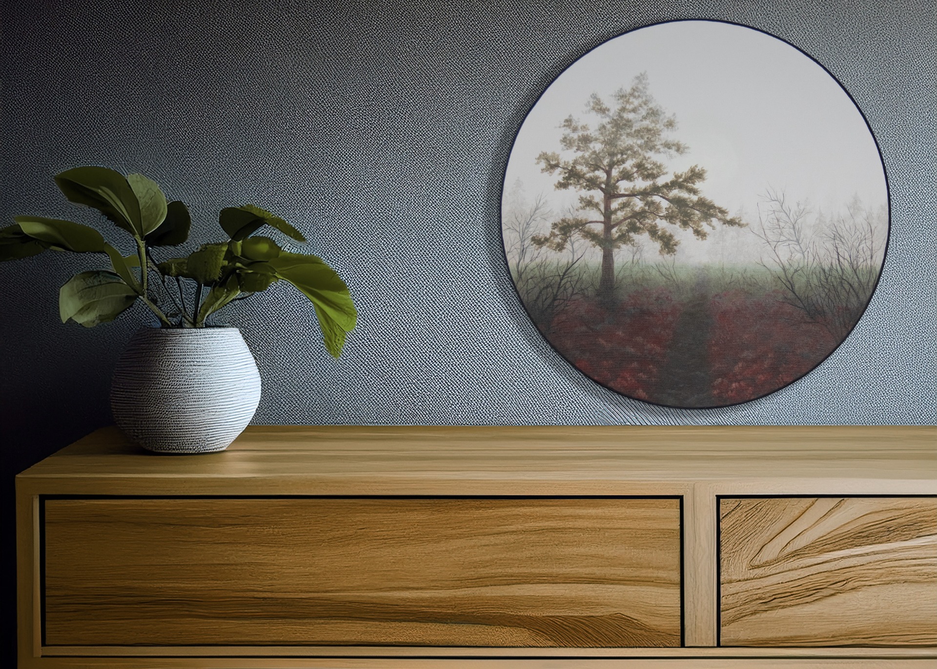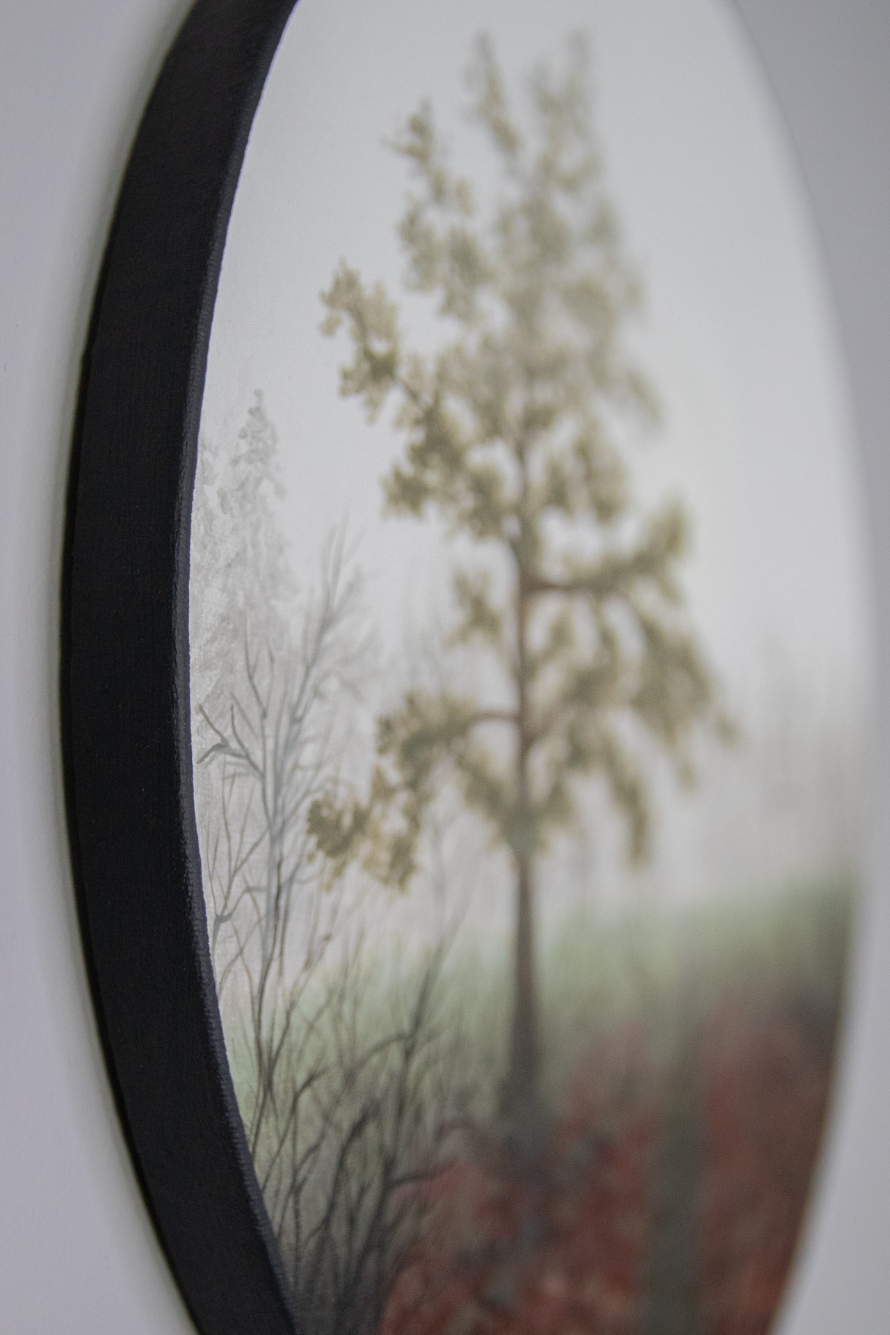 Sumupäivä-maalaus on saanut inspiraationsa loppusyksyn sumuisista maisemista ja maaruskan hehkusta. Akryylimaalaus pellavakankaalle, jonka tekstuuri antaa maalaukseen oman luonteensa. Halkaisija 40 cm, syvyys 2 cm. Reunat maalattu mustaksi ja ne jatkuvat hieman kuvapinnan päälle luoden illuusion kehyksistä. Arvioitu toimitusaika noin kaksi viikkoa. Kuljetus Suomen sisällä kuuluu hintaan.