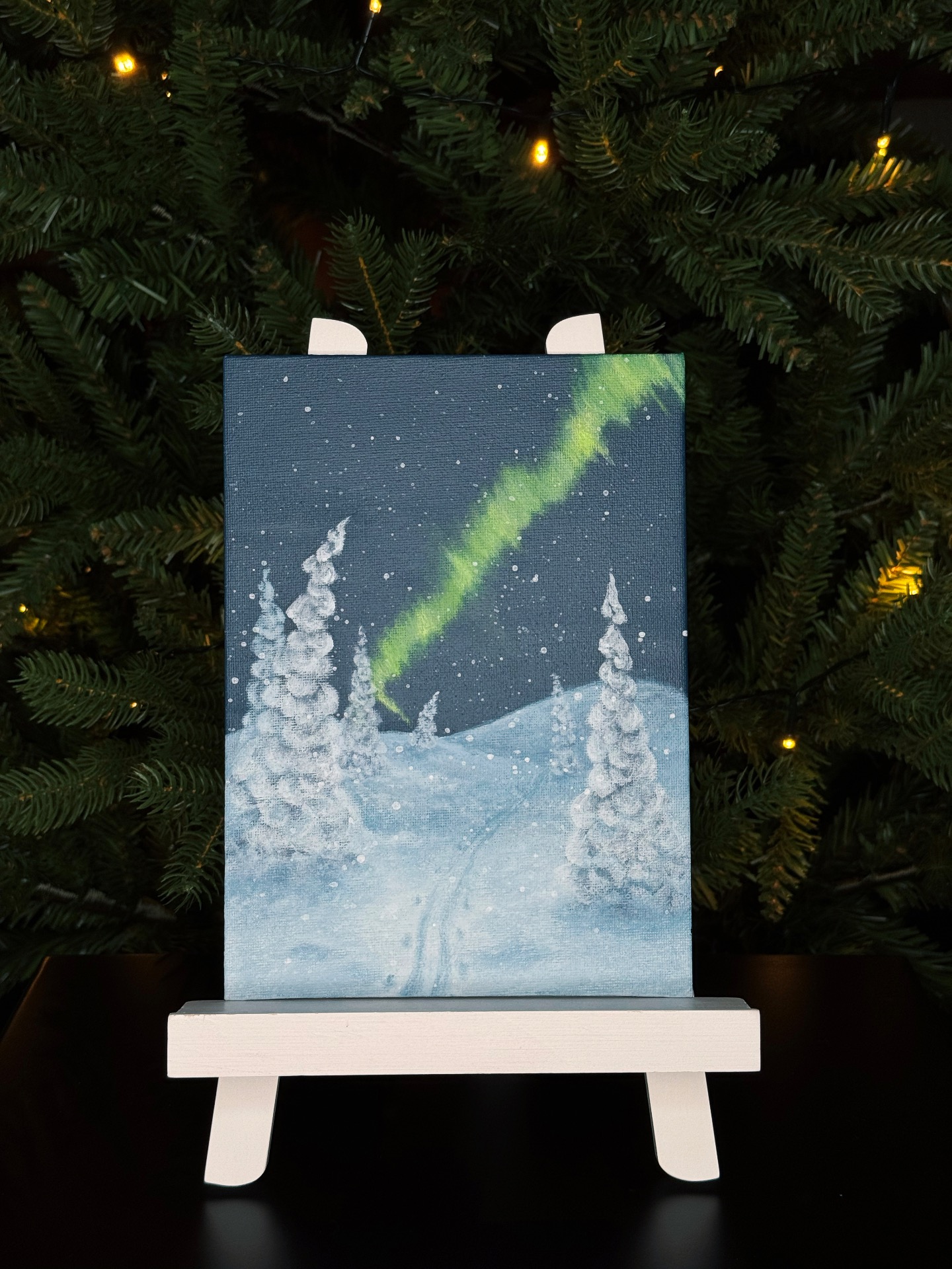 Hiihtoretki tunturissa tykkylumikuusten seurassa. Akryylimaalaus kangaspahvipohjalle, koko 16x22 cm. Kortin paksuus noin 3 mm. Vaaleanharmaa/luonnonvalkoinen taustapahvi, maalauksen pinta viimeistelty vernissalla. Toimitusaika noin kaksi viikkoa. Toimitus Suomen sisällä kuuluu hintaan.