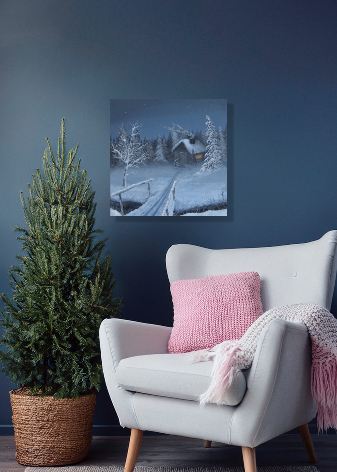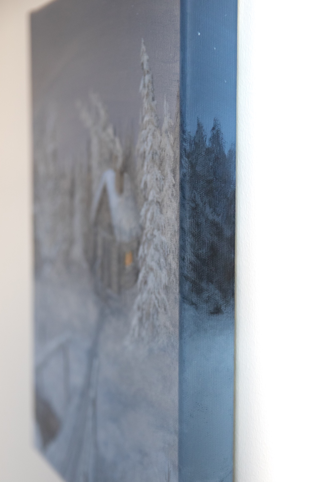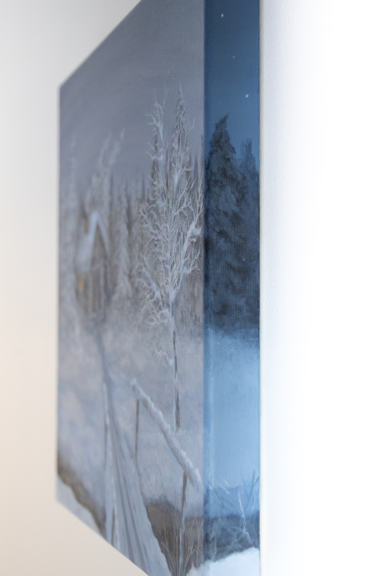 Mikä sen ihanampaa kuin hiihtoretkeily kaamoksen sinisessä hämärässä? Hiihdon lomassa on mukava piipahtaa lämmittelemässä autiotuvalla. Akryylimaalaus puuvillakankaalle. Koko 40x40x3,5 cm (L,K,S). Ripustusvalmis, maalaus jatkuu reunojen yli. Arvioitu toimitusaika noin kaksi viikkoa. Kuljetus Suomen sisällä kuuluu hintaan.